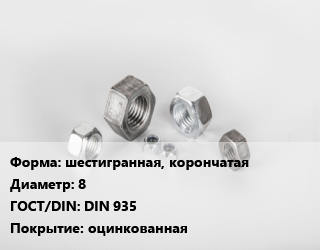 Гайка шестигранная, корончатая D=8 DIN 935 оцинкованная, шт, 2 цена от 25.89 ₽ / кг, где купить, условия доставки в Барнауле и Барнаульской области