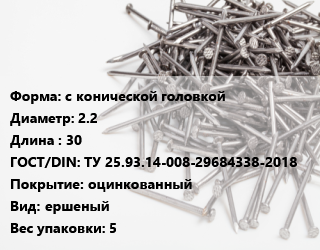 Гвоздь с конической головкой 2.2х30 ГОСТ: ТУ 25.93.14-008-29684338-2018 оцинкованный ершеный 5