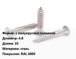 Саморез с полукруглой головкой D=4.8 L=35 сталь RAL 3005, шт цена от 2.97 ₽ / кг, где купить, условия доставки в Барнауле и Барнаульской области