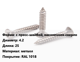 Саморез с пресс-шайбой, наконечник-сверло D=4.2 L=25 металл RAL 1018, шт цена По запросу где купить, условия доставки в Барнауле и Барнаульской области