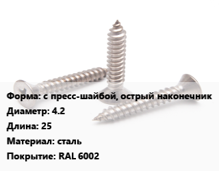 Саморез с пресс-шайбой, острый наконечник D=4.2 L=25 сталь RAL 6002, шт цена По запросу где купить, условия доставки в Барнауле и Барнаульской области