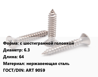 Саморез с шестигранной головкой D=6.3 L=64 нержавеющая сталь ГОСТ: ART 9059, шт цена от 5.4 ₽ / кг, где купить, условия доставки в Барнауле и Барнаульской области