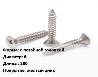 Саморез с потайной головкой D=6 L=280 желтый цинк, упаковка 200 шт цена от 2 850 ₽ / кг, где купить, условия доставки в Барнауле и Барнаульской области