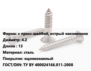 Саморез с пресс-шайбой, острый наконечник D=4.2 L=13 сталь оцинкованный ГОСТ: ТУ BY 400024166.011-2008, упаковка 1000 шт, РМЗ цена от 316.56 ₽ / кг, где купить, условия доставки в Барнауле и Барнаульской области