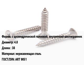 Саморез с цилиндрической головкой, внутренний шестигранник D=4.8 L=38 нержавеющая сталь ГОСТ: ART 9051, упаковка 3000 шт цена от 3 141 ₽ / кг, где купить, условия доставки в Барнауле и Барнаульской области