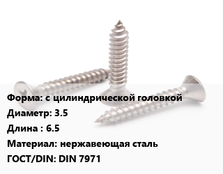 Саморез с цилиндрической головкой D=3.5 L=6.5 нержавеющая сталь ГОСТ: DIN 7971, упаковка 1000 шт цена от 405.59 ₽ / кг, где купить, условия доставки в Барнауле и Барнаульской области