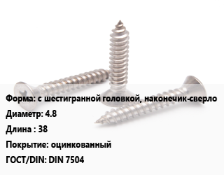 Саморез с шестигранной головкой, наконечик-сверло D=4.8 L=38 оцинкованный ГОСТ: DIN 7504
