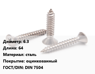 Саморез 6.3 L=64 сталь оцинкованный ГОСТ: DIN 7504