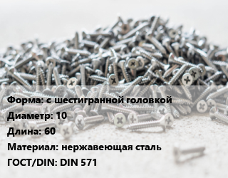 Шуруп с шестигранной головкой 10х60 нержавеющая сталь ГОСТ: DIN 571, шт цена от 37.72 ₽ / кг, где купить, условия доставки в Барнауле и Барнаульской области