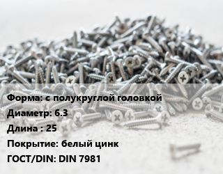 Шуруп с полукруглой головкой 6.3х25 белый цинк ГОСТ: DIN 7981, упаковка 1000 шт цена от 1 610 ₽ / кг, где купить, условия доставки в Барнауле и Барнаульской области