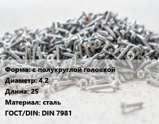 Шуруп с полукруглой головкой 4.2х25 сталь ГОСТ: DIN 7981, упаковка 1000 шт цена от 608.45 ₽ / кг, где купить, условия доставки в Барнауле и Барнаульской области