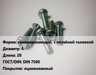 Винт самонарезающий, с потайной головкой 6х20 DIN 7500 оцинкованный, 4.8, цена за шт, кг цена от 2.07 ₽ / кг, где купить, условия доставки в Барнауле и Барнаульской области