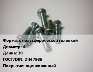 Винт с полусферической головкой 4х30 DIN 7985 оцинкованный, цена за 1000 шт,цена за шт, кг цена от 378.54 ₽ / кг, где купить, условия доставки в Барнауле и Барнаульской области