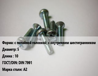 Винт с потайной головкой, с внутренним шестигранником 5х10 DIN 7991 Сталь: A2, по запросу, кг цена от 28.35 ₽ / кг, где купить, условия доставки в Барнауле и Барнаульской области