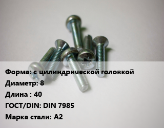 Винт с цилиндрической головкой 8х40 DIN 7985 Сталь: А2, цена за шт, кг цена от 38.48 ₽ / кг, где купить, условия доставки в Барнауле и Барнаульской области