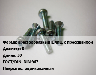 Винт крестообразный шлиц, с прессшайбой 8х30 DIN 967 оцинкованный