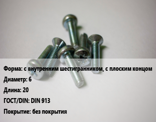 Винт с внутренним шестигранником, с плоским концом 6х20 DIN 913 без покрытия