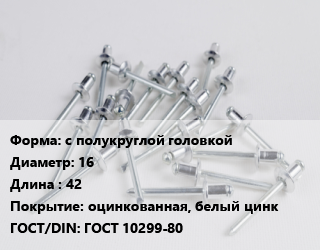 Заклепка с полукруглой головкой 16х42 оцинкованная, белый цинк ГОСТ: ГОСТ 10299-80