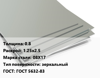 Лист нержавеющий 0.8 1.25х2.5 Сталь: 08Х17 Тип:зеркальный ГОСТ 5632-83