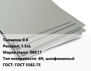 Лист нержавеющий 0.8 1.5хL Сталь: 08Х17 Тип:4N, шлифованный ГОСТ 5582-75