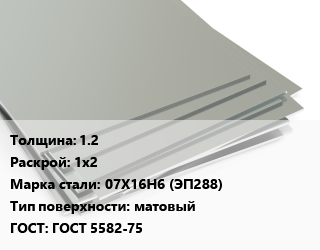 Лист нержавеющий 1.2 1х2 Сталь: 07Х16Н6 (ЭП288) Тип:матовый ГОСТ 5582-75, кг цена от 637.5 ₽ / т, где купить, условия доставки в Барнауле и Барнаульской области