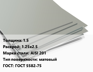 Лист нержавеющий 1.5 1.25х2.5 Сталь: AISI 201 Тип:матовый ГОСТ 5582-75, шт цена от 13 372 ₽ / т, где купить, условия доставки в Барнауле и Барнаульской области