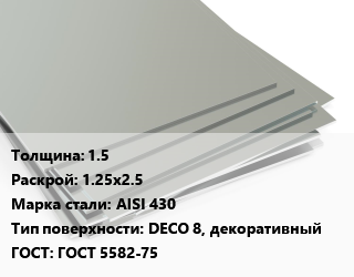 Лист нержавеющий 1.5 1.25х2.5 Сталь: AISI 430 Тип:DECO 8, декоративный ГОСТ 5582-75, м2 цена от 3 400 ₽ / т, где купить, условия доставки в Барнауле и Барнаульской области