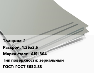 Лист нержавеющий 2 1.25х2.5 Сталь: AISI 304 Тип:зеркальный ГОСТ 5632-83