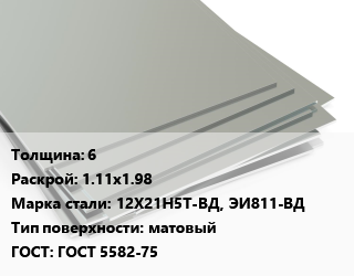 Лист нержавеющий 6 1.11х1.98 Сталь: 12Х21Н5Т-ВД, ЭИ811-ВД Тип:матовый ГОСТ 5582-75